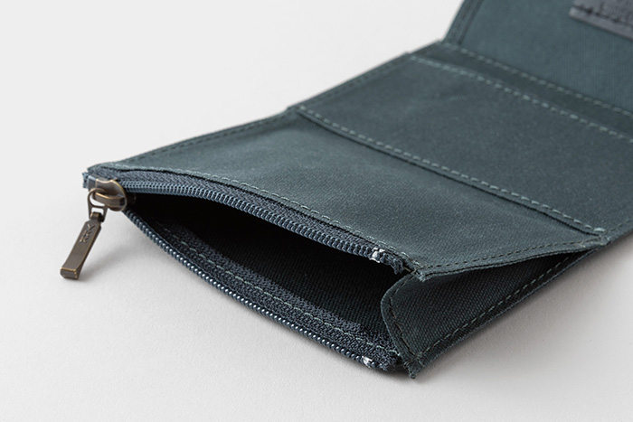 파라핀 코팅 가공한 얇은 면 소재로 도쿄 근교 장인들이 손수 제작한 이 코튼 지퍼케이스는 왼쪽에 카드 수납 포켓이, 오른쪽에 동전이나 열쇠를 넣을 수 있는 지퍼 포켓이 있습니다.